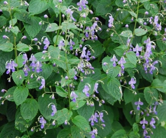Contrairement aux autres espèces du genre qui sont des arbustes, Caryopteris divaricata est une grande plante vivace disparaissant en hiver. En saison, elle atteint entre 1 et 1.2 m de haut et environ 50 cm de large. En fin d'été et automne, elle se couvre de fleurs bleues de forme originale et sont surmontées par leurs grandes étamines courbées. Ses fleurs aux allures exotiques en font une plante très originale au jardin. Très résistante au froid, elle se plaira au soleil dans un sol pas trop sec en été ou à mi-ombre. A utiliser en massifs, en isolé ou en grosse potée. Plante rare dans les jardins, croissance rapide.