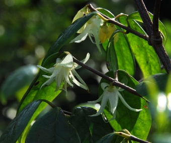 Chimonanthus nitens est un arbuste dont les fleurs sont blanches assez translucides et non odorantes. Elles apparaissent en fin d'automne, en octobre-novembre. Ses feuilles brillantes sont persistantes, et cela permet d'avoir un arbuste vert toute l'année. Idéal en haie vive par exemple. Il atteint entre 1.5 et 2.5 m de haut et presque autant de large. Ses fleurs ont une forme très originale. Soleil non brulant ou mi-ombre dans tout type de sol. z6. Plants ramifiés de 40-50 cm environ.