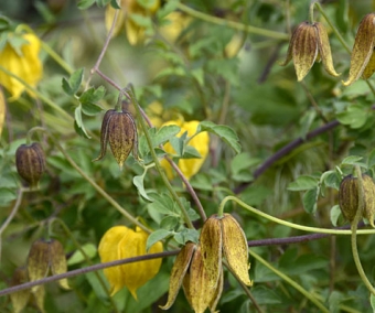 Une vigoureuse clématite himalayenne, issue d'une collecte de graines à Ghyaru au Népal, avec un feuillage très sain toute la belle saison, avec de beaux reflets vert-gris. Belles fleurs en clochettes jaune foncé tachetées de brun et aux pétales très charnus. La floraison commence dès le printemps jusqu'en début d'été avant de laisser place aux fruits décoratifs. Elle se marie très bien avec un rosier grimpant, de préférence remontant pour le mélange des fleurs. Elle habillera un grillage, un arbre mort...