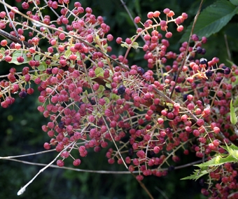 Coriaria sinica reste vraiment trop méconnu et ce n'est pas mérité. On le classe dans les arbustes bien qu'il ai souvent une végétation qui repart assez bas sur la souche au printemps. En général, on le taille donc assez court début mars mais en prenant garde de conserver le bois vivant car c'est sur les rameaux de l'année précédente qu'apparaissent les fleurs. En saison, il atteint environ 1 m de haut et ses branches densément feuillés portent des fleurs sans grand intérêt. C'est ensuite qu'il devient intéressant. En effet, les tiges se couvrent de fruits rouge foncé devenant noirs. La plante est alors très décorative. Vu sa taille réduite, je cultive le mien dans un massif de grandes vivaces (asters, iris de Sibérie, inules, sauges...) avec qui il se marie bien. A planter au soleil, dans toute bonne terre de jardin même un peu lourdes ou caillouteuses. z6. Jeunes sujets
