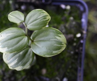 'Utage' est une variété japonaise dont les feuilles arrondies sont vertes marquées de jaune sur les bords et la pointe.