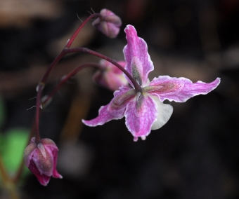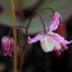A new Japanese selection, with white and striped pink flowers, long-spurred. The young leaves are red.all leaves emerge with a reddish tint. The white flowers are narrow-petaled and long-spurred with a pink stripe on the petals.