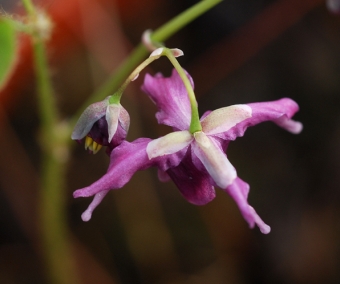 Un superbe Epimedium hybride sélectionné au Japon. Fleurs rose assez foncé surtout en boutons, éperons de longueur moyenne. Feuillage partiellement caduque, reparait au printemps.