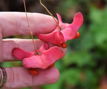 Euonymus macropterus est un grand arbuste caduc de 2 à 3 m de haut dont les feuilles prennent de superbes couleurs rouges en automne. Ses fleurs, en mai, sont verdâtres et suivies de grands fruits ailés rose foncé avec des graines orange. C'est une espèce impressionnante en automne par la taille de ses fruits qui sont, pour moi, les plus gros du genre. Un arbuste très beau à l'automne. Soleil ou mi-ombre dans toute bonne terre de jardin. Tolère le calcaire. Très rustique, z5. Plants de 50/60 cm, rare, quantité très limitée.