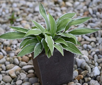 Un très joli hosta miniature obtenu au Japon, nous n'avons toujours pas trouvé son nom. Les feuilles mesurent 6 à 10cm de long et sont vertes marginées de blanc pur, avec des stries aléatoire vert clair. La rosette mesure environ 15 cm de large et 10 cm de haut, il est préférable de le cultiver dans un petit pot pour profiter de son élégance mais il peut également servir de petit couvre sol à l'avant d'un massif.