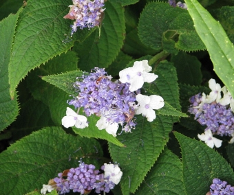 Hydrangea involucrata est un petit arbuste de moins d'un mètre de haut, originaire du Japon. Ses feuilles sont proportionellement assez grandes, et duveteuses. Il fleurit en fin de printemps-début d'été, en petites grappes rondes de fleurs bleues mauves (qui ne changent pas de couleur en fonction du pH du sol), entourées de quelques fleurs stériles blanc pur.