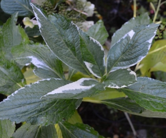 Hortensia originaire du Japon, il est surtout remarquable pour son feuillage assez allongé, aléatoirement panaché de blanc sur les bordures et de gris vert sur le centre du limbe.