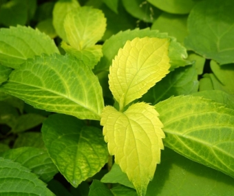 Sans doute une première introduction en Europe pour cet hortensia vraiment original. Il a un feuillage de taille moyenne, entre un macrophylla et un serrata. Celui-ci est assez clair, presque doré au printemps, puis verdit ensuite. En été se produit un phénomène étonnant : ses feuilles blanchissent et deviennent couleur crème ! Un effet très lumineux à l'ombre. Il semble que ce phénomène se produise surtout dans les régions à étés chauds... En début d'été, inflorescences aplaties bleues ou roses selon la nature du terrain, avec les fleurs stériles mauve clair avec le coeur blanc sur le pourtour.