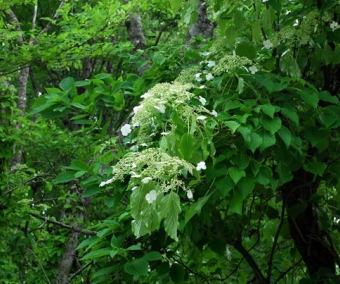 Hortensia grimpant pour l'ombre, sa croissance est moyennement rapide mais il peut progressivement recouvrir la façade entière d'un bâtiment si on ne le taille pas. Il grimpe seul et n'a pas besoin de support. Le feuillage vert clair est caduque, la floraison en grosses ombelles blanches, lâches, a lieu au printemps.