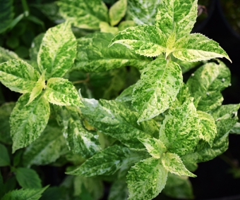 'Fuji Snowstorm' est très lumineux à l'ombre avec ses feuilles fortement mouchetées de blanc. En haut des tiges, fleurs blanches en début d'été.