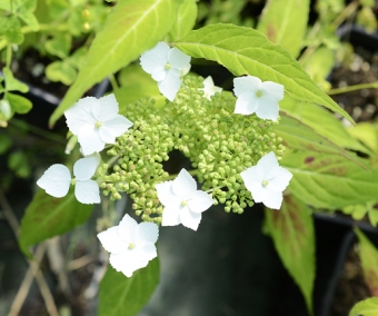 'Shiko Amacha' est une variété basse, de 40/50 cm de haut seulement mais plus large. Ses feuilles sont allonées, étroites et vert clair. En juin, ilflorescences aplaties blanches avec de grandes fleurs stériles dentelées. Très lumineux à l'ombre. Culture facile en situation ombragée dans toute bonne terre de jardin pas trop sèche.