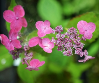Un massif d'ombre sans hortensia n'est pas pensable ! Après une longue période de boules blanches, roses ou bleues, les Hydrangea connaissent un renouveau sans précédent avec l'arrivée des hortensias japonais et de nombreuses espèces chinoises et himalayennes, mais aussi par les nouveaux cultivars qui marquent une tendance au retour vers des inflorescences plus simples, se rapprochant des fleurs sauvages, avec des têtes florales plus aplaties, moins lourdes et où les fleurs fertiles font leur réapparition. On y gagne en légèreté et ses nouveaux hortensias sont plus faciles à associer aux autres plantes sauvages de nos massifs d'ombre. De plus, les hortensias japonais nous ont amené des variétés naines qui trouveront leur place plus facilement dans les petits jardins. Le choix dans les couleurs et formes de fleurs est immense et il y en aura pour tous les goûts. Les hortensias se plantent à l'ombre ou à mi-ombre, dans toute bonne terre de jardin ne séchant pas trop. Leur culture est facile. On pourra planter les petites variétés japonaises parmi des plantes vivaces du style Podophyllum, arisaemas, ligulaires, astilbes, Chelonopsis, sauges, Actaea, Thalictrum, Tricyrtis...