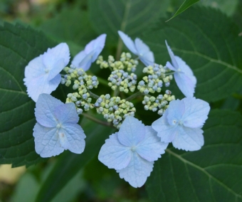 Hydrangea serrata var. yezoensis est la forme sauvage du serrata qui pousse dans l'île centrale du Japon (Honshu). de taille moyenne (1m à 1,2m), c'est une superbe plante par son feuillage très denté, et ses inflorescences abondantes bleu ciel, aux fleurs stériles elles-aussi dentelées. En terrain neutre les fleurs tireront sur le rose clair.