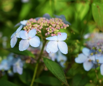 Hydrangea serrata est appelé l'hortensia des montagnes au Japon. Les japonais en ont crée un nombre incalculable aux formes et couleurs très diverses. Beaucoup de ces variétés ont un développement modeste propice aux petits jardins et leurs petites feuilles donnent un aspect plus léger à la plante que certains H.macrophylla.