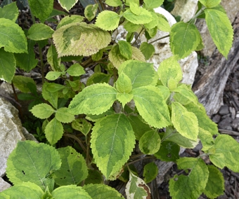 'October Moon' diffère du type par ses larges feuilles vertes bordées de vert très clair. Une belle plante. Culture en situation ombragée, en toute bonne terre de jardin.