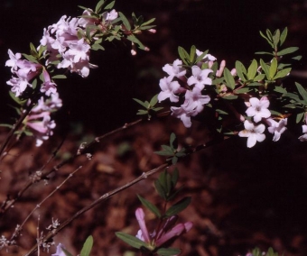 Arbuste de faible encombrement, élégant en tous points : feuillage fin vert glauque, port semi arqué, superbe floraison rose parfumée abondante au printemps.