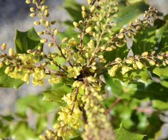 Proches des Berberis par les fleurs jaunes, les mahonias s'en distinguent nettement par leurs feuillages et leurs ports plus raides. On peut trouver de superbes espèces aux allures de plantes « exotiques ». Les floraisons en longues grappes sont également très décoratives. De plus, leurs feuilles restent toute l'année sur la plante.