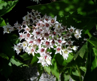 On en connaît quelques variétés mais il est étonnant de voir que la forme type est si rarement proposée. C'est pourtant, de loin, la plus vigoureuse et la plus florifère. La plante inratable au jardin. C'est une espèce intéressante pour son feuillage et sa floraison qui est précoce, en mars même dans les régions froides. Les fleurs apparaissent avant ou en même temps que les feuilles. Les inflorescences portent de très nombreuses fleurs blanchâtres (parfois légèrement rosées). Les feuilles sont arrondies et plus ou moins profondément lobées. Elle couvrent le sol et sont surmontées par les fleurs au printemps. La plante atteint alors 20/40 cm de haut. S'il est vrai que le Mukdenia est une plante d'ombre et de fraîcheur, nous en cultivons aussi en rocaille, en pleine lumière. Elle a donc une grande facilité d'adaptation. z5