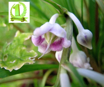 Un Ophiopogon collecté sur la montagne Qingsheng dans le Sichuan et sans doute introduit pour la première fois. Espèce très originale par ses fleurs blanches et roses de couleur et taille inhabituelles. Longues feuilles arquées vert foncé.