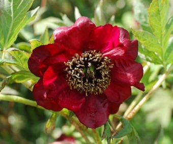 Superbe pivoine arbustive de Chine, proche de la fameuse Paeonia lutea jaune, mais à fleurs rouge foncé. Atteint entre 1 et 1.5 m de haut, floraison au printemps, à planter au soleil en sol drainé.