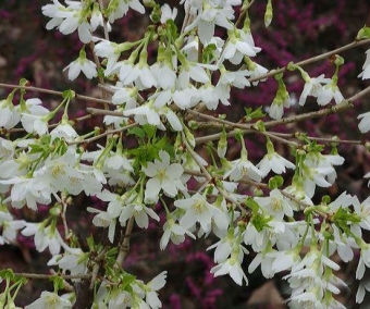 Cerisier à fleurs japonais, de développement modeste (environ 2m de haut). Ce cultivar possède des fleurs campanulées simples blanches, d'une grande pureté, abondantes en fin d'hiver (avant l'apparition des feuilles.) La floraison se prolonge plusieurs semaines et annonce l'arrivée du printemps. qui dure 3 à 4 semaines. Un petit bijou pour les petits jardins, les bords de mare, les potagers, les cours... mais aussi dans les massifs. Il convient également à la culture en pot. Le feuillage se colore en automne ce qui ajoute à son charme.
