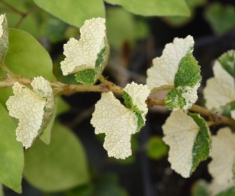 Un superbe Rubus panaché, Rubus rolfei est déjà à la base un très joli petit rampant à feuilles gaufrées, légèrement découpées en lobes arrondis et duveuteuses sur le revers. les tiges sont + rugueuses que réellement épineuses. C 'est un chouette couvre-sol de mi-ombre ou de soleil léger, originaire des montagnes de Taïwan.