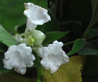 Plante vivace himalayenne de la famille des acanthes (mais non épineuse, au contraire, elle a les feuilles finement velues). De longues tiges plus ou moins rampantes se redressant au bout portant de grandes feuilles vert-gris. A l'automne, une belle floraison avec de grandes fleurs blanc pur, tubulaires et pendantes. Encore méconnue, cette plante poussera très bien à mi-ombre, dans un lieu frais ne desséchant pas trop en été. Culture possible en pot ou jardinière où elle adoptera un port retombant très élégant. En pleine terre, elle peut aussi être utilisée en couvre-sol. Croissance rapide et vigoureuse, atteint environ 30/50 cm de haut et plus de large. Attention, plants disponibles courant mars 2016, quantité limitée, à réservé dès maintenant !