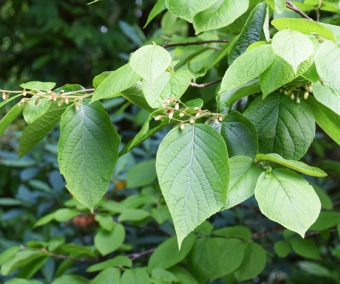 Styrax hemsleyanus fait partie des espèces à grandes feuilles. Celles-ci sont fortement nervurées. Au printemps, grappes de fleurs blanches et parfumées. Une espèce rare mais tout à fait rustique puisqu'elle a passé les -18°C ici sans problème. Plants de 30 cm environ, quantité très limitée.