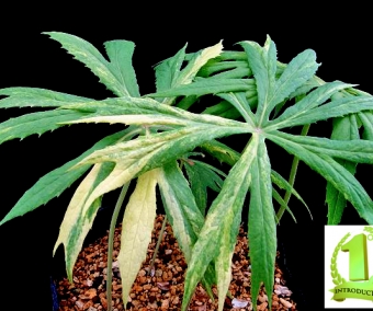 Syneilesis palmata 'Hakikomi Fu' est une rare variété japonaise dont les feuilles sont variablement panachées de jaune crème. Un plus pour les situations sombres. z5