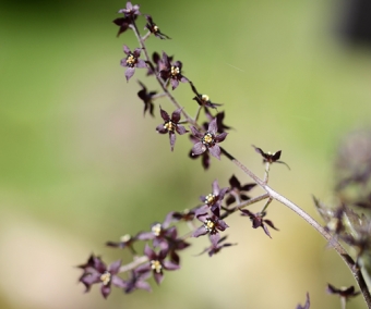 Vivace ou arbuste ? Ses tiges sont ligneuses mais cette plante se comporte plutôt comme une vivace. Mesurant 30/50 cm de haut environ, la plante se propage par ses stolons souterrains qui émettent des tiges dressées portant des feuilles composées. Ses inflorescences peuvent dépasser 20 cm de long et portent, au printemps, des fleurs étoilées pourpre foncé. Culture à mi-ombre en toute bonne terre de jardin ne desséchant pas trop.